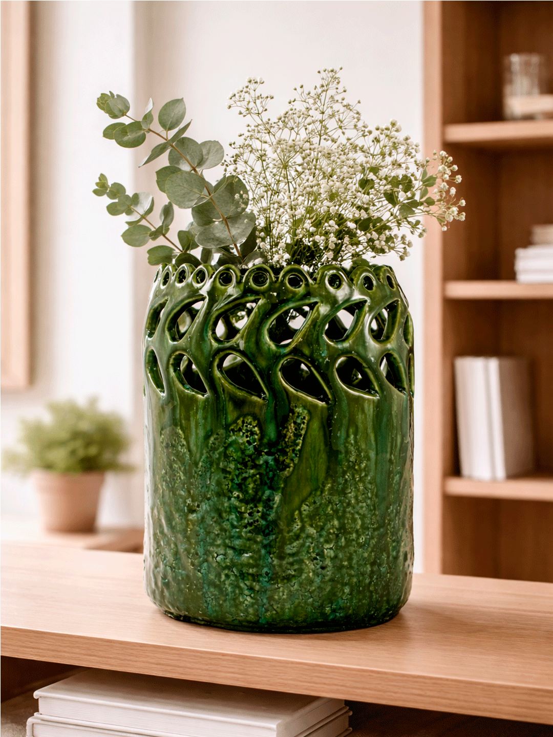 Pieza única vidriada con polvos fundidos en verdes intensos que realzan un delicado tallado de hojas en su borde.