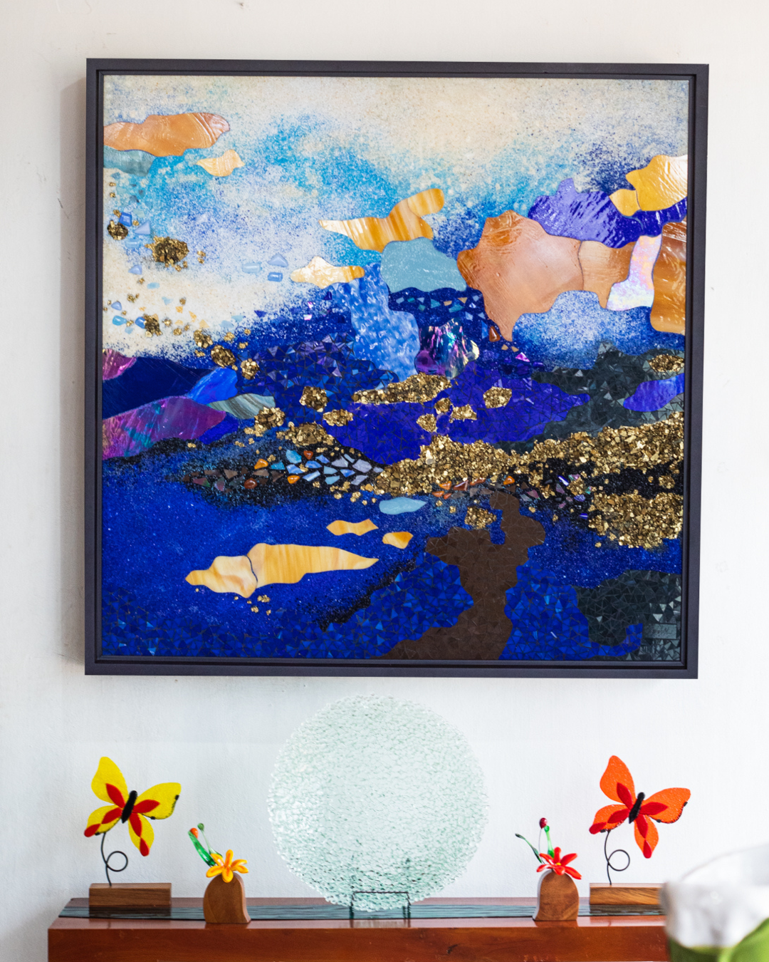 • Cuadro de diseño único hecho a mano bajo técnica mixta de mosaico en vidrio artístico, degradados en polvos de vidrio en frío y polvos de vidrio en dorado.