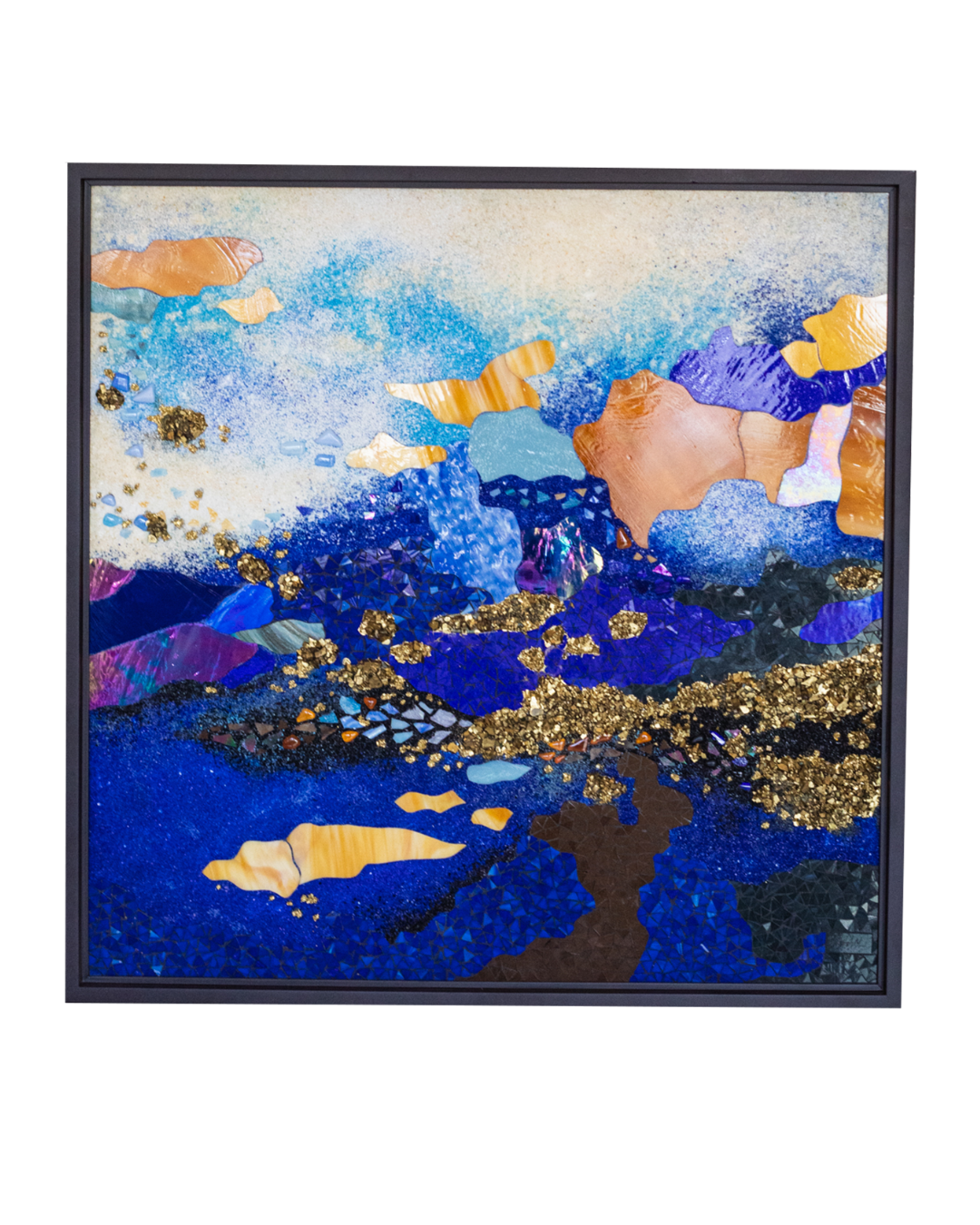 Un oleaje de color que captura el instante en que la luz toca el agua. Vidrios azules y dorados se funden, evocando la danza del mar y el resplandor del sol.